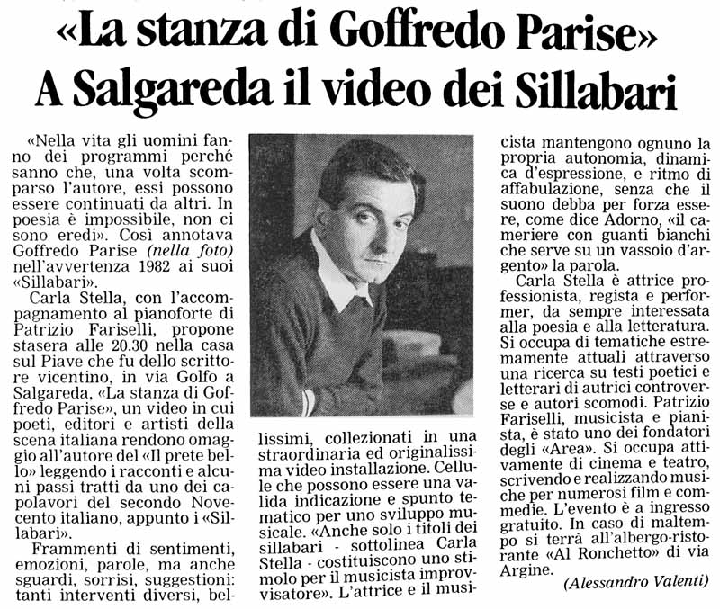 Sillabari. Un'attrice e trentadue voci. Parise rivive in dvd Nicolò Menniti-Ippolito - Il Mattino di Padova, La Tribuna di Treviso, La Nuova Venezia, 13 Settembre 2008 Scrittori e poeti leggono i Sillabari Valeria Lipparini - Il Gazzettino, 14 Settembre 2008 Nelle stanze di Parise Giambattista Marchetto - Il Gazzettino, 16 Settembre 2008 "Una stanza" e l'omaggio a Parise - artisti e scrittori leggono i "Sillabari" Il Treviso, 18 Settembre 2008 Parise e "I sillabari", letture d'autore Il Gazzettino, 18 Settembre 2008 "La stanza di Goffredo Parise" - A Salgareda il video dei Sillabari Alessandro Valenti - La Tribuna di Treviso, 19 Settembre 2008 "Cadere nel tempo" tra musica e poesia “Poesia e musica, due piaceri e due forme espressive, entrambe brevi e irrazionali. Questi, intrecciati, gli ingredienti di Cadere nel tempo, spettacolo di Carla Stella (foto) andato in scena al bastione Alicorno di Padova. Buon successo di pubblico, complice anche il suggestivo scenario medievale. Pur senza mai nominarle, Stella ha evocato le esistenze di tre poetesse del Novecento, Cvetaeva, Sexton e Plath. Tre vite terminate drammaticamente in un suicidio, eppure artisticamente piene di senso. Legate dall'attrice in suggestioni di sogno, acqua, sesso e morte a formare un essere unico, la Poesia al femminile... Sostanziale l'apporto del suono, curato da un trio di ottimi improvvisatori tra le note del jazz e delle sonorità d'ambiente, a volte dai caratteri demoniaci e inquietanti. Una performance che ha sfruttato efficacemente l'antico bastione, e che mercoledì toccherà un altro luogo d'eccezione: il mausoleo di Cecilia Metella a Roma. L.F.” Corriere della Sera / Corriere del veneto, 21 luglio 2006 Carla Stella: "Leggendo Musil voglio trasmettere la forza della vita" Paola Gabrielli - Corriere della Sera / Corriere di Bologna, 2 Aprile 2008 Donne nell'autodistruzione “..al Bastione Alicorno il monologo di Carla Stella, .. un viaggio attraverso l'esistenza e la scelta della morte come naturale precipitato della condizione di creatura di intelletto e di uomo. ” Il mattino di Padova, 23 luglio 2006 Centro Porsche Roma. Porsche live. “.. L'energia di un monologo che esplora la vita di tre donne…. l percorsi lirici delle voci femminili più appassionate del XX secolo si intrecciano con la musica eseguita dal vivo, realizzando una costante ed intensa relazione sonora..” programma della rassegna Le poetesse del Novecento sulle mura “Poesia e musica, due piaceri e due forme espressive, entrambe brevi e irrazionali. Questi, intrecciati, gli ingredienti di Cadere nel tempo…” Corriere della Sera / Corriere del veneto, 23 luglio 2006 L'Undici settembre di Carla Stella relativo allo spettacolo Cenere “… un assolo che Carla Stella s'è cucito addosso legando assieme brani di Pascal, di Edgar Allan Poe, di Cesare Pavese, del poeta ingIese Auden e della rockstar Patti Smith. Lo spettacolo sfrutta anche i supporti video sulla "New York visionaria" di Renato Pengo. Le musiche sono di Edoardo Arengi e le foto utilizzate sono di Antonio Concolato. … a dominare resta la parola, quella di Carla Stella, ideatrice del progetto e protagonista invisibile di questa situazione teatrale multimediale. “ Il mattino di Padova, 25 settembre 2002 rassegna stampa completa rtf file |